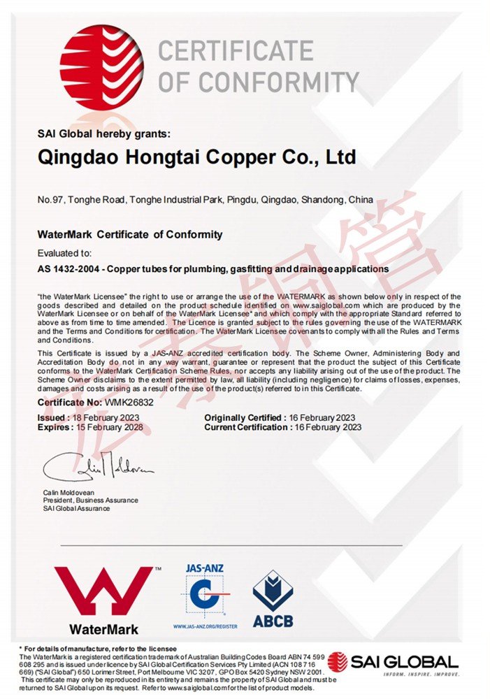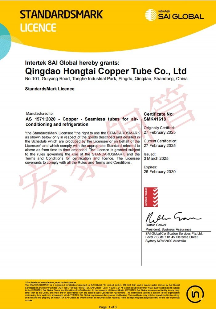 宏泰銅管產(chǎn)品順利通過AS 1571無縫制冷用銅管標準認證【證書編號:SMK41618】和AS 1432給排水銅管標準認證【證書編號:WMK26832】。